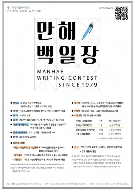 3.1독립선언을 기념하고 만해스님의 민족애와 문학정신을 기리는 전국만해백일장이 2년 만에 열린다. 대한불교청년회(이하 KYBA)는 경상북도, 경상북도교육청, 예천군과 함께 제41회 전국만해백일장을 공동 주최한다고 밝혔다. 1979년 첫 대회를 시작으로 41회째를 맞은 만해백일장은 대통령상, 장관상, 국회의장상, 도지사상 등 대학 입학 시 가산점이 부여되는 공신력을 자랑하며 청소년 문학가 발굴의 장이다. 장정화 KYBA 중앙회장은 “올해는 진행 방식을 바꿔 예선·본선을 나눠 치를 예정이다. 대회도 중요하지만 전국 학생들이 참...