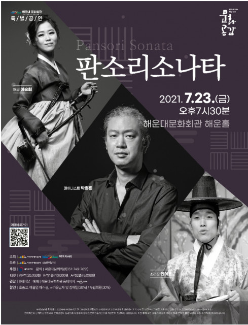 해운대문화회관(관장 김영순)은 7월 23일 금요일 해운대문화회관 해운홀에서 ‘판소리 소나타’를 무대에 올린다. 판소리 소나타는 한문연 방방곡곡 문화공감사업으로 문화예술회관에서 유치한 국공립·민간예술단체의 우수공연 프로그램 초청경비를 일부 지원받는 사업이다. 판소리 소나타는 민간예술단체 우수공연 프로그램으로 선정된 작품이며 한국문화예술위원회, 해운대문화회관 공동주최로 부산 관객에게 새로운 예술의 무대를 선사한다. 판소리 다섯마당 중 춘향가, 수궁가, 적벽가에 서양 작곡가 쇼팽, 모차르트와 베토벤의 곡들을 더해 만들어진 곡들은...