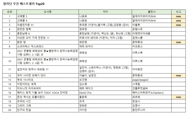 일제 강점기 경성을 배경으로 한 시대극 로맨스 웹툰 ‘고래별’이 단행본 4, 5권 예약 판매 개시와 함께 나란히 알라딘 베스트셀러 1, 2위에 올랐다. ‘고래별’은 네이버 웹툰에 2019년 6월 첫 연재를 시작해 6월 105화를 마지막으로 완결됐다. ‘고래별’은 평점 9.9를 꾸준히 기록하는 등 연재 기간 내 독자들의 호평이 이어졌으며 테이크원스튜디오를 통한 드라마 제작도 최근 확정된 것으로 알려졌다. 주 구매층은 20대 여성으로 전체 구매 고객의 51.2%를 차지하고 있다. 2003년부터 꾸준히 출간돼 어린이들의 사랑을 ...