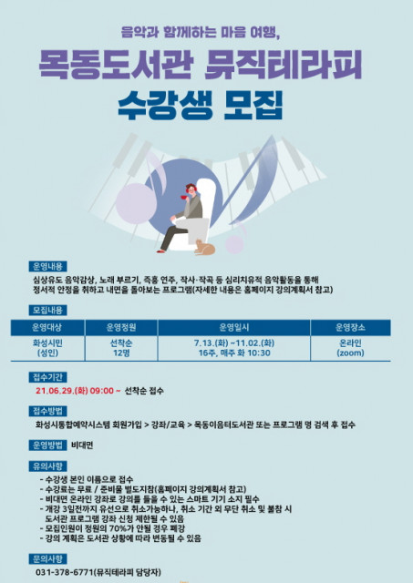 화성시문화재단(대표이사 이종원)은 동탄목동이음터도서관에서 진행하는 음악심리치료 프로그램 ‘목동도서관 뮤직테라피’ 참가자를 6월 29일부터 모집한다. ‘목동도서관 뮤직테라피’는 화성시문화재단이 운영하는 동탄목동이음터도서관의 특화 주제인 ‘음악’을 소재로 코로나19 장기화로 지친 시민들의 정서적 안정과 스트레스 해소를 돕기 위해 마련한 프로그램이다. 프로그램을 통해 음악 감상, 노래 부르기, 즉흥 연주, 작사·작곡 등 다양한 음악 활동을 하며 자신의 내면을 돌아보는 시간을 가진다. 또한 프로그램 참여자 간 소그룹 활동을 통해 ...