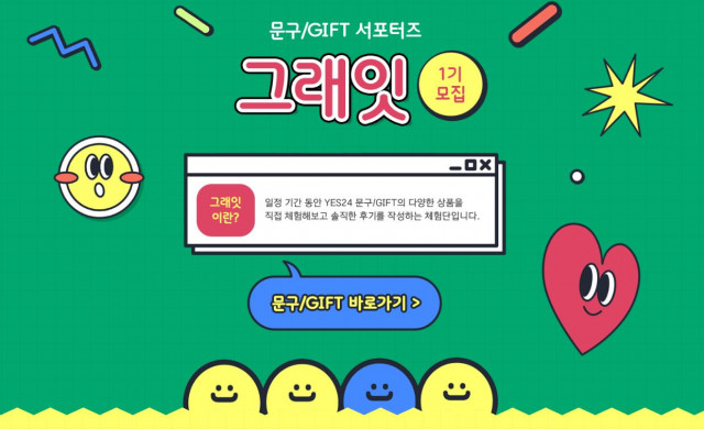 대한민국 대표 서점 예스24(대표 김석환)가 7월 4일까지 예스24의 다양한 문구·GIFT 상품들을 체험할 수 있는 서포터즈 ‘그래잇’ 1기를 모집한다. 올해 처음 모집하는 예스24 문구·GIFT 서포터즈 ‘그래잇’은 소비자들에게 예스24의 다양한 문구·GIFT 상품들을 체험할 수 있는 기회를 제공하고 다양한 상품들을 널리 알리기 위해 기획됐다. 서포터즈 ‘그래잇’ 지원은 평소 문구와 생활용품에 관심이 많고 개인 SNS 활동이 활발한 사람이라면 누구나 응모할 수 있으며 예스24 공식 홈페이지에서 신청서 제출을 통해 지원...