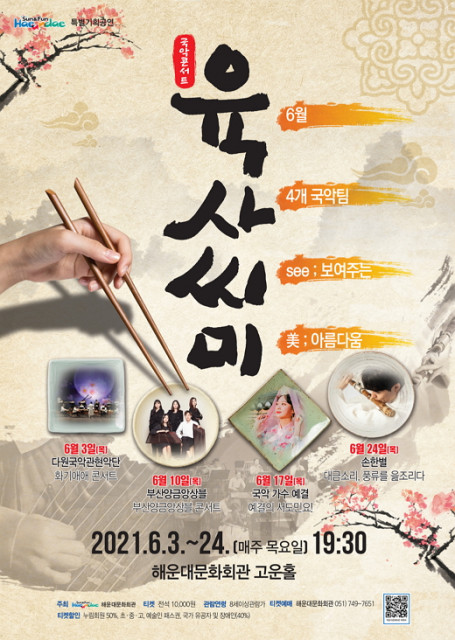 해운대문화회관(관장 김영순)은 6월 매주 목요일마다 해운대문화회관 고운홀에서 국악의 무대를 관객들에게 선사한다. ‘6월 4주간 4개의 국악팀이 보여주는(see) 국악의 아름다움(美)’을 테마로 다원국악관현악단과 부산양금앙상블, 국악 가수 예결, 대금연주자 손한별의 무대로 국악관현악에서 독주악기 대금의 무대까지 국악의 다채로움을 선보인다. 육.사.씨.미는 해운대문화회관에서 처음으로 시도하는 국악 상설 공연으로 국악 장르의 저변 확대와 활성화를 위해 기획했다. 육사씨미의 첫 공연으로는 국악의 저변 확대와 전통예술의 계승과 발전을...
