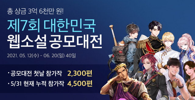 웹소설 연재 플랫폼 문피아가 5월 12일부터 6월 20일까지 40일간 진행되는 제7회 대한민국 웹소설 공모대전의 중간 결과를 공개했다. 공모대전 시작 후 20일이 지난 5월 31일 현재까지, 누적 참가작 수만 4500편을 돌파했다. 문피아는 올해도 과거 공모대전의 기록을 모두 경신할 것이라고 전망했다. 기성작가는 물론 웹소설 작가를 꿈꾸는 누구나 쉽게 참여할 수 있어 공모대전 개최 첫날부터 2300편이 접수됐으며, 2000명이 넘는 참가자들이 대거 작품 등록을 하는 진기록을 세웠다. 이런 기세라면 지난해 공모대전 전체 참가자...