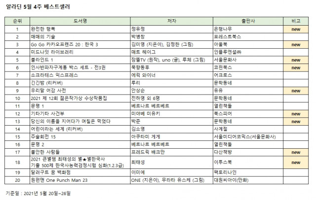 알라딘 인터넷서점은 정유정 작가의 신작 장편소설 ‘완전한 행복’이 예약 판매개시 하루 만에 알라딘 주간 베스트셀러 1위에 올랐다고 밝혔다. 1월 1주 이미예 작가의 ‘달러구트 꿈 백화점’이 주간 베스트셀러 1위에 오른 후 4개월 만에 한국 장편소설이 다시 베스트셀러 1위에 오르게 된 것이다. ‘완전한 행복’은 발표하는 작품마다 독자들의 열광적인 지지를 받으며 한국문학의 대체 불가한 작가로 자리매김한 정유정의 신작 장편소설이다. 자기애의 늪에 빠진 한 인간이 자신의 행복을 위해 타인의 삶을 휘두르기 시작할 때 발현되는 일상의 악...