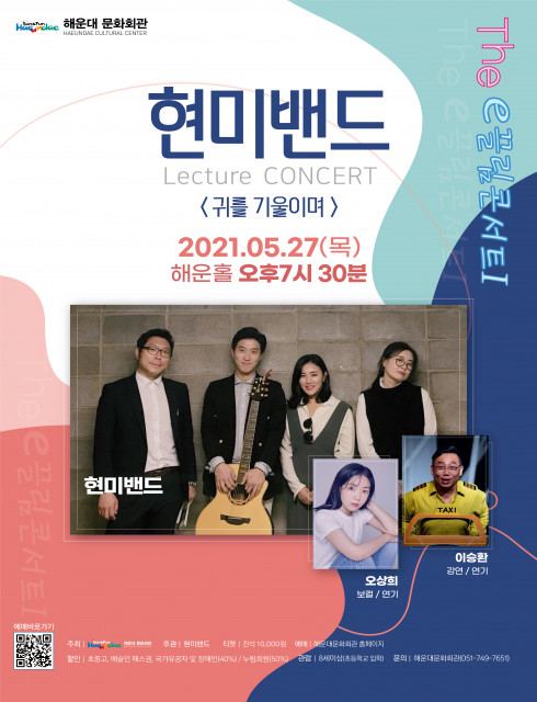 해운대문화회관(관장 김영순)은 5월 27일부터 12월까지 매달 마지막 주 문화가 있는 날, 목요일 해운홀에서 2021년 ‘The-e 끌림 콘서트(이하 이끌림 콘서트)’를 무대에 올린다. The-e 끌림 콘서트는 Emotion(희로애락의 감정, 정서)과 이끌림을 표하는 해운대문화회관의 2021 감성 충만 소통형 공연이다. 지역예술인의 창작 동기 부여 및 역량 강화와 다양한 문화예술 장르의 소규모 지역 콘텐츠를 관객들에게 선사한다. The-e 끌림 콘서트의 5월 27일 첫 공연은 현미밴드의 Lecture Concert ‘귀를 기...