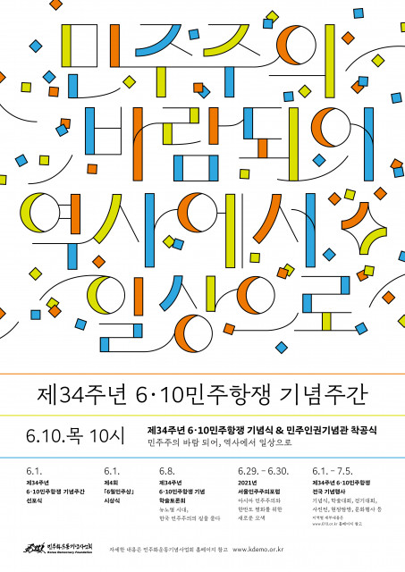 6·10민주항쟁 34주년을 기념하기 위한 다양한 기념행사가 6월 한 달간 전국에서 펼쳐진다. 민주화운동기념사업회(이사장 지선, 이하 사업회)는 6월 1일(화) 제34주년 6·10민주항쟁 기념주간을 선포하고, 그 의미를 기리기 위한 전국 행사를 소개한다고 밝혔다. 올해 기념주간의 슬로건은 ‘민주주의 바람 되어, 역사에서 일상으로’로 정했다. 바람에는 두 가지 의미를 담아, 바람이 불 듯 민주주의가 퍼져나간다는 뜻과 동시에 사람들의 소망과 희망을 담는 바람의 뜻도 포함하고 있다고 사업회는 설명했다. 제34주년 6·10민주...