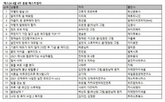 예스24 4월 4주 종합 베스트셀러는 인기 만화 시리즈의 마지막화 ‘귀멸의 칼날 23’이 3주 연속 1위에 등극했다. 어른을 위한 힐링 판타지 소설 ‘달러구트 꿈 백화점’은 한 계단 상승해 2위에 올랐고, 50억 자산가 아버지가 자녀에게 경제의 기본 원리와 부의 노하우를 전하는 ‘아들아, 돈 공부해야 한다’는 3위를 기록했다. 국민 육아멘토 오은영 박사의 현실 밀착 육아법 ‘어떻게 말해줘야 할까’가 전주와 동일한 4위, 브라이언 그린의 10년 만의 신작 ‘엔드 오브 타임’은 새로운 5위다. 어린이 만화 시리즈가 인기를 끌고 ...