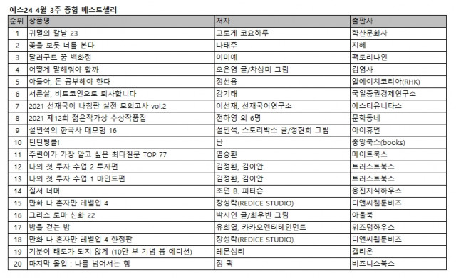 예스24 4월 3주 종합 베스트셀러는 인기 만화 시리즈의 마지막화 ‘귀멸의 칼날 23’이 2주 연속 1위에 등극했다. 나태주 시인의 작품 가운데 블로그나 트위터 등에서 자주 언급되는 시를 모아 엮은 ‘꽃을 보듯 너를 본다’가 새롭게 2위에 올랐고, 어른을 위한 힐링 판타지 소설 ‘달러구트 꿈 백화점’은 지난주와 같은 3위로 나타났다. 국민 육아 멘토 오은영 박사의 현실 밀착 육아법 ‘어떻게 말해줘야 할까’는 세 계단 상승한 4위, 50억 자산가 아버지가 자녀에게 경제의 기본 원리와 부의 노하우를 전하는 ‘아들아, 돈 공부해야...