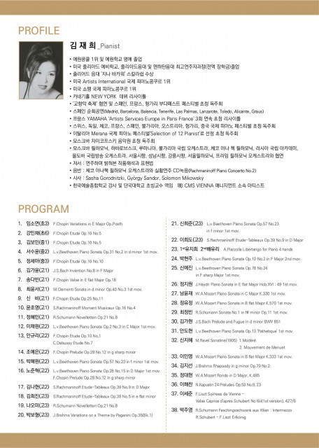 피아니스트 김재희의 클래스 콘서트가 4월 17일(토) 오후 2시 코스모스 아트홀에서 열린다. 매년 회를 거듭하며 다채로운 프로그램으로 관객들에게 다가가고 있는 김재희 클래스 콘서트는 올해 스타인웨이 초청 시리즈로 선정돼 9번째 연주를 맞는다. 이번 클래스 콘서트의 지도 교수인 피아니스트 김재희는 예원학교와 미국 줄리아드 예비학교를 거쳐 줄리아드 음대 및 맨해튼 음대 최고 연주자 과정을 전액 장학금으로 졸업한 수재다. 예원 콩쿠르 1위 등 국내 유수 콩쿠르에서 입상한 그는 △미국 쇼팽 국제 피아노 콩쿠르 1위 △미국 Artis...