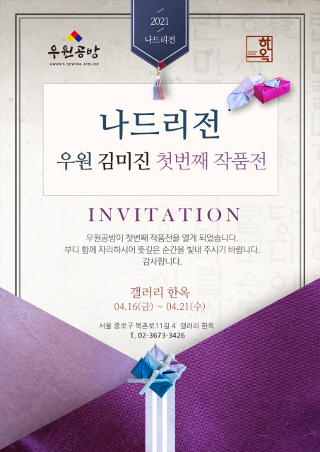 전통 보자기를 제작하고 있는 김미진 작가가 2021년 4월 16일부터 4월 21일까지 북촌 한옥마을 ‘갤러리 한옥’에서 첫 번째 전시회를 개최한다. 김미진 작가는 30년 이상 보자기와 수공예품을 만들어온 디자이너로 현재 을지로에서 우원 공방을 운영 중이다. 우원 공방은 을지로 방산시장 인근에서 운영되고 있는 보자기 전문 업체로 다양한 보자기 작품과 상품을 기획, 제작하고 있는 업체이다. 김 작가는 업계에서는 소문난 장인으로 알려져 있으며, 덕분에 많은 기업의 VIP용 보자기들과 다양한 상품을 디자인 제작하고 있다. 국내에서 ...
