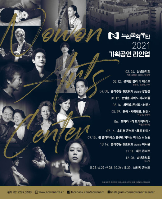 노원문화재단(이사장 김승국)이 2021 기획공연 라인업을 공개했다. 노원문화재단이 운영하는 노원문화예술회관은 웅장하고 깨끗한 사운드를 느낄 수 있는 최고의 음향과 첨단 조명 장비를 갖추고 음악 애호가들을 기다리고 있다. 게다가 더 매력적인 것은 이곳에서 일 년 내내 다양한 장르와 초호화 출연진이 펼치는 명품 공연이 이어진다는 것이다. 비록 서울 변방의 지역 공연장이지만 코로나19 장기화로 질식할 것 같은 시민들에게는 산소와 같은 핫플레이스가 될 것이다. ◇지휘자 김대진, 피아니스트 임동혁의 ‘신년음악회’로 오픈 한국예술종합...