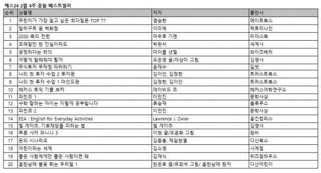 예스24 2월 4주 종합 베스트셀러에서는 주식 전문가 ‘염블리’ 염승환의 주린이를 위한 참고서 ‘주린이가 가장 알고 싶은 최다질문 TOP 77’이 금주에도 1위를 기록했다. 어른을 위한 힐링 판타지 소설 ‘달러구트 꿈 백화점’과 마우로 기예 와튼스쿨 교수의 미래 전망서 ‘2030 축의 전환’도 전주와 동일하게 2위와 3위를 유지했다. 대한민국을 대표하는 작가 박완서의 10주기 기념 에세이 ‘모래알만 한 진실이라도’와 마이클 샌델 하버드대학 교수의 신작 ‘공정하다는 착각’은 다섯 계단씩 상승해 각각 4위와 5위에 올랐다. ...