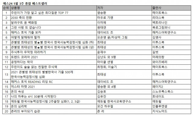 예스24 1월 3주 종합 베스트셀러에서는 주식투자 전문가 ‘염블리’ 염승환의 주린이를 위한 참고서 <주린이가 가장 알고 싶은 최다질문 TOP 77>이 예약판매와 동시에 1위에 등극했다. 마우로 기예 와튼스쿨 교수의 미래 전망서 <2030 축의 전환>은 2위를 유지했고, 어른을 위한 힐링 판타지 소설 <달러구트 꿈 백화점>은 두 계단 내려 3위에 안착했다. 원태연 시인이 18년 만에 쓴 신작 시와 그의 대표 시를 묶은 필사시집 <그런 사람 또 없습니다>가 새로운 4위, 주제별 연상 암기로...