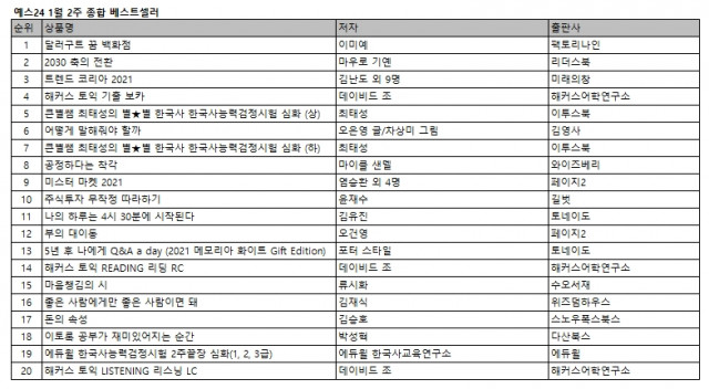 예스24 1월 2주 종합 베스트셀러에서는 예스24 독자가 선정한 ‘2020 올해의 책’ 어른을 위한 힐링 판타지 소설 <달러구트 꿈 백화점>이 3주 연속 1위에 등극했다. 마우로 기예 와튼스쿨 교수의 미래 전망서 <2030 축의 전환>이 2위에 올랐고, 서울대 소비트렌드 분석센터의 2021 트렌드 전망서 <트렌드 코리아 2021>은 3위를 차지했다. 주제별 연상 암기로 쉽고 재미있게 단어를 외울 수 있는 <해커스 토익 기출 보카>가 4위, 큰별쌤 최태성의 한국사능력검정시험 수험서 <...