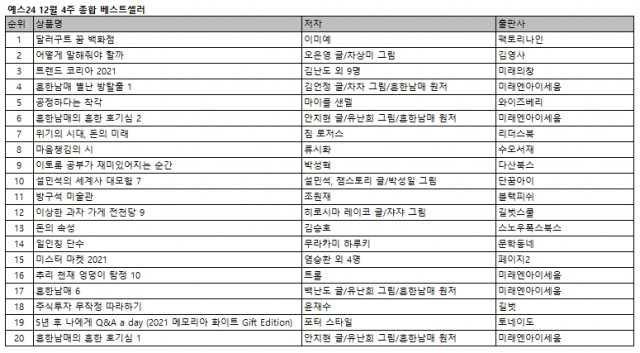 예스24 12월 4주 종합 베스트셀러에서는 예스24 독자가 선정한 ‘2020 올해의 책’ 어른을 위한 힐링 판타지 소설 <달러구트 꿈 백화점>이 새롭게 1위에 등극했다. 국민 육아멘토 오은영 박사의 훈육법 <어떻게 말해줘야 할까>는 2위를 차지했고, 서울대 소비트렌드 분석센터의 2021년 트렌드 전망서 <트렌드 코리아 2021>이 3위를 유지했다. 유튜브 크리에이터 ‘흔한남매’의 인기 콘텐츠인 ‘방탈출 시리즈’를 콘셉트로 한 스토리북 <흔한남매 별난 방탈출 1>은 새로운 4위, 마이클 ...