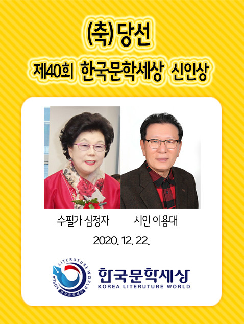 한국문학세상(회장 김영일)은 2020년 마지막 작가 등용문으로 11월 1일부터 한 달간 국민을 대상으로 ‘제40회 한국문학세상 신인상’ 작품을 인터넷으로 공모해 2명을 당선자로 선정했다. 수필 부문에서는 심정자(77세·인천문인협회), 시 부문에서는 이용대(72세)가 당선됐다. 김영일 심사위원장(시인·수필가)은 심정자 수필가에 대해 “수필 ‘애완견 둘리’를 통해 사람과 동물이 하나의 가족이라는 것을 누구나 공감하고 느낄 수 있도록 진한 감동으로 그려냈다”는 심사평을 남겼다. 이 작품은 초등학교에 다니는 손녀가 강아지를 ...