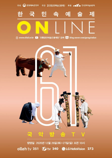 전통공연예술진흥재단(이사장 정성숙)은 국내 최장수 민속축제인 ‘제61회 한국민속예술제’를 12월 21일(월)부터 온라인 축제로 개최한다. 1958년 ‘전국민속예술경연대회’라는 명칭으로 창설된 한국민속예술제는 국내에서 가장 오래된 민속축제다. 탈춤, 강강술래 등 150여개 종목의 국가 및 지방무형문화재 지정, 12개 종목 유네스코 인류무형문화유산 등재 등 전국에 산재하는 700여 종목의 우리 민속예술을 발굴하고 보존하는 데 이바지해 왔다. 올해 한국민속예술제는 코로나19로 역사상 처음 경연대회 없이 온라인을 통해 개최된다. 전...