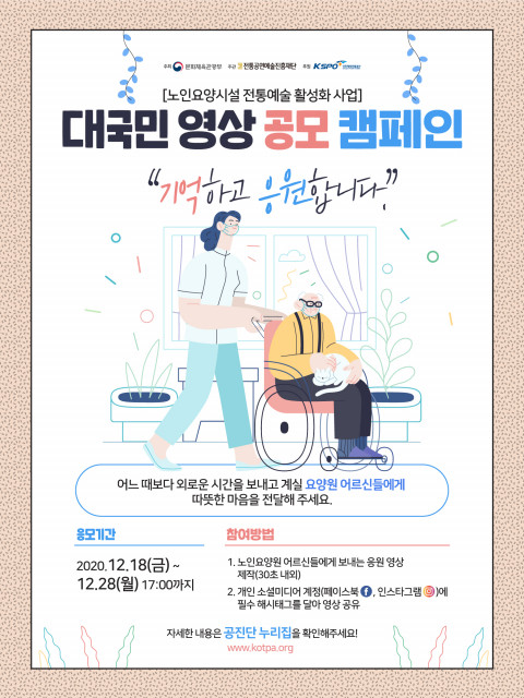 전통공연예술진흥재단(이사장 정성숙)은 ‘노인요양시설 전통예술 활성화 사업’의 일환으로 12월 18일(금)부터 12월 28일(월)까지 대국민 온라인 영상 공모 캠페인을 진행한다. 전통공연예술진흥재단은 2018년부터 문화예술을 접할 기회가 제한적인 노인요양시설 입소 어르신을 대상으로 문화향유 사업을 펼쳐왔다. 매년 전통예술단체 20여 팀을 선발해, 감상 위주의 공연이 아닌 참여형 공연 프로그램을 개발 및 진행하며 요양시설 어르신들에게 전통예술 체험과 일상의 즐거움을 선사해왔다. 기존에는 직접 시설에 찾아가는 방식이었지만 올해는 ...