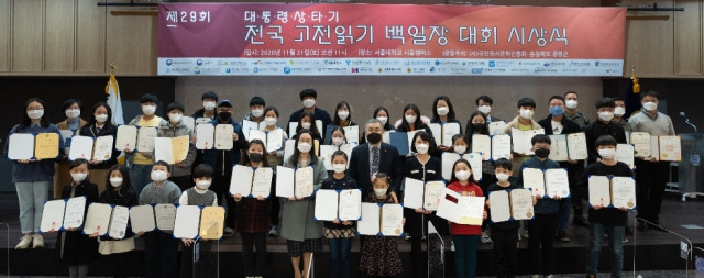 국민독서문화진흥회(이하 ‘진흥회’, 회장 김을호)가 21일 오전 11시 서울대학교 시흥캠퍼스에서 ‘제29회 전국 고전읽기 백일장 대회’ 시상식을 개최했다고 23일 밝혔다. 진흥회와 충북 증평군이 주최·주관한 이번 행사는 1991년부터 전국 초·중·고·대학·일반인을 대상으로 우리고전의 교훈을 알게 하고, 대중보급화의 하나로 개최한 백일장 대회에서 뛰어난 필력을 발휘한 참가자들을 포상하기 위해 마련됐다. 매년 300여명의 수상자와 가족들이 참여하는 대규모로 개최되는 행사지만 올해는 코로나19와 최근 사회적 거리두기 단계...