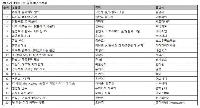 예스24 11월 3주 종합 베스트셀러에서는 국민 육아멘토 오은영 박사의 훈육법 <어떻게 말해줘야 할까>가 4주 연속 1위를 기록했다. 서울대 소비트렌드 분석센터가 2021년 트렌드를 전망한 <트렌드 코리아 2021>은 3주 연속 2위다. 펀딩 1812% 달성 및 전자책 출간 즉시 베스트셀러 등극으로 화제를 모은 힐링 판타지 소설 <달러구트 꿈 백화점>과 미국 두 개 주의 변호사 시험에 합격한 김유진 변호사가 전하는 새벽 기상의 힘 <나의 하루는 4시 30분에 시작된다>, 어린이들에게 한...