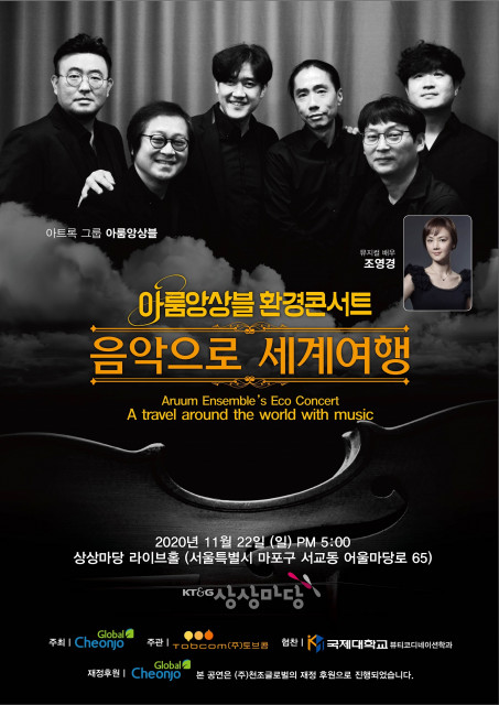 우리 민요와 정통 클래식에 ‘Rock’의 영혼을 담아낸 아트록 밴드 ‘아룸앙상블’이 22(일) 17:00~18:30 서울 ‘KT&G상상마당 홍대’ 라이브홀에서 환경을 주제로 한 소규모 단독공연을 개최한다. 아룸앙상블은 2006년에 창단해 각자의 지역 및 소속단체에서 전문적인 활동을 하던 연주자들이 특별한 공연을 위하여 만든 그룹으로 UN 아시아태평양지역 정책결정자 회의 축하 연주를 선사해 수많은 참석자들로부터 기립박수를 받은 적도 있다. 이 후 아룸앙상블 대표 박재호(저대)와 음악감독 류근상(드럼/작·편곡), ‘고스트윈드...