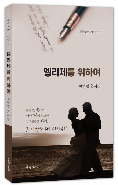 경북 문경에서 태어나 계간 ‘스토리문학’으로 등단한 천영필 시인이 세 번째 시집이자 사랑의 대서사시집인 ‘엘리제를 위하여’를 펴냈다. 이 시집은 그가 군대 생활을 하며 애인에게 보낸 연애편지를 모아 묶은 것으로 40여년이 지나 지금은 그의 아내가 된 그때 애인이 연애편지를 모아 시집으로 만들어보는 것이 어떻겠냐는 제안에서 탄생했다. 천영필 시인은 ‘아내에게 이 시집을 바친다’라는 제목의 자서에서 “반전에 반전을 거듭하면서 / 여기 까지 왔다 // 사십 여 년이 지난 / 오로지 사랑이라는 한 가지만을 추구했던 지설의 / 몽환...