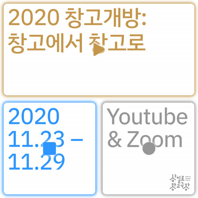 서울문화재단(대표이사 김종휘) 삼일로창고극장은 공동운영단과 함께 기획 프로그램 ‘2020 창고개방: 창고에서 창고로’(이하 ‘창고개방’, 기획 전윤환·허영균)를 23일(월)부터 29일(일)까지 선보인다. ‘창고개방’은 ‘삼일로창고극장을 개방하라’는 콘셉트로 2018년 개관 이후부터 이어오고 있는 삼일로창고극장의 대표 프로그램이다. 올해는 신종 코로나바이러스감염증-19(이하 코로나19)로 인해 멈춰버린 공연예술계의 시간을 기록하는 프로그램을 진행한다. 관객과 직접 만나 작품을 펼쳐온 공연예술 장르의 특성이 흔들린 지금, ‘창작...