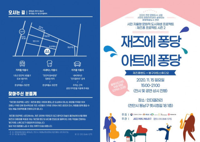재즈퐁 프로젝트가 11월 15일 ‘재즈퐁 프로젝트 시즌 2: 재즈에 퐁당, 아트에 퐁당’ 공연을 성공적으로 마쳤다고 16일 밝혔다. 재즈퐁 프로젝트 시즌2는 천안 문화도시 사무국이 진행하는 ‘2020 천안 문화도시 사업’의 시민 프로젝트 가운데 하나다. 다양한 장르 및 분야와의 컬래버레이션을 통해 재즈에 대한 대중들의 문턱을 낮추고, 재즈 대중화를 이루는 게 목표다. 2019년 11월 ‘트로트와 재즈의 달콤한 만남’이라는 주제로 시즌 1을 진행했다. 시즌 2는 시즌 1을 기획한 ‘재즈퐁 밴드’와 바다를 콘셉트로 플루이드 아트...