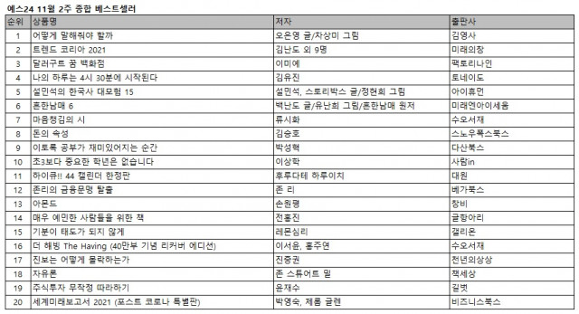 예스24 11월 2주 종합 베스트셀러에서는 국민 육아멘토 오은영 박사의 훈육법 <어떻게 말해줘야 할까>가 3주 연속 1위에 등극했다. 서울대 소비트렌드 분석센터가 2021년을 전망한 <트렌드 코리아 2021>도 2주 연속 2위를 차지했다. 펀딩 1812% 달성, 전자책 출간 즉시 베스트셀러로 화제를 모은 힐링 판타지 소설 <달러구트 꿈 백화점>은 두 계단 상승해 3위로 나타났고, 미국 두 개 주의 변호사 시험에 합격한 김유진 변호사가 전하는 새벽 기상의 힘 <나의 하루는 4시 30분에 시작...
