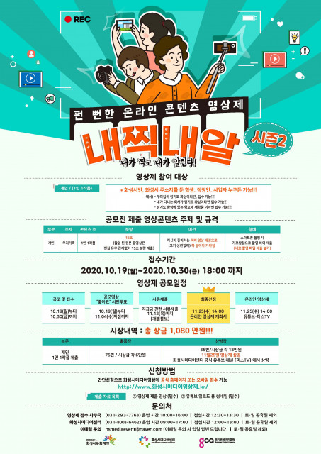화성시문화재단이 운영하는 화성시미디어센터가 시민들의 미디어콘텐츠 제작 능력 향상을 위해 온라인 콘텐츠 영상제를 개최, 출품작을 19일부터 추가 모집한다고 밝혔다. 펀 뻔한 온라인 콘텐츠 영상제 <내찍내알>은 ‘내가 찍고 내가 알린다’는 의미로 시민들이 직접 제작하여 제출한 작품 중 선정하여 시즌1 선정작과 함께 11월 25일(수) 진행되는 온라인 영상제에서 상영할 예정이며 온라인 영상제는 코로나19 감염 예방을 위해 비대면으로 운영된다. 이 영상제의 참여 대상은 시즌1의 모집부문과 다르게 개인부문으로만 모집한다. ...