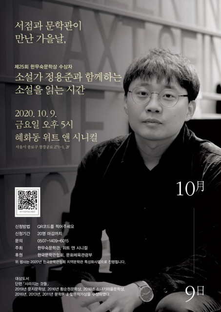 시집서점 위트 앤 시니컬과 한무숙문학관은 서점과 문학관이 만난 가을, 소설가 정용준을 초청해 10월 9일 금요일 오후 5시에 혜화동 위트 앤 시니컬에서 소설 읽는 시간을 마련했다. 위트 앤 시니컬의 유희경 시인이 진행하는 이 행사는 작가와 독자가 한 편의 소설을 함께 읽는 참여형 소설 낭독회로 낭독 대상 작품은 작가의 단편소설 ‘사라지는 것들’이다. 마음의 계절인 가을, 채워진 것보다 비워져가는 것에 눈이 갈 때 따뜻한 곁이 될 수 있는 소설을 만나는 시간이 될 것으로 기대된다. 소설가 정용준은 2009년 ‘현대문학’으로...