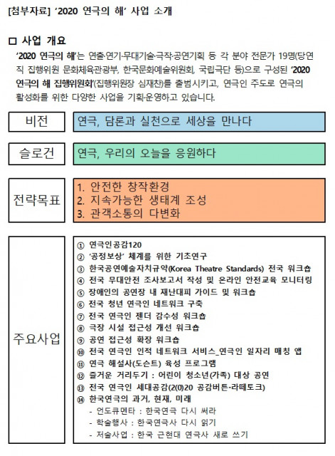 ‘2020 연극의 해’ 14가지 사업 가운데 안전한 창작환경 조성을 목표로 추진되는 ‘한국공연예술자치규약(Korea Theatre Standards) 전국 워크숍’이 10월 8일부터 11개 지역에서 열린다. 이번 사업을 통해 각 지역 예술가들은 어떤 고민을 품고 활동하는지, 지역에서 주목해야 할 현안들은 무엇인지 현장의 구체적인 이야기를 듣고, 지역에서 활동하는 창작자들과 현장 의견을 나누며 성인지 감수성을 높여 안전한 창작환경을 위해 최소한의 안전망을 만드는 구체적인 방법을 찾고자 한다. 한국공연예술자치규약은 안전한 창작환...