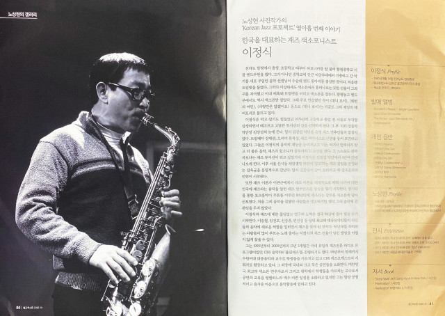 노상현 사진작가는 “월간색소폰(10월호)에 연재 중인 코리안 재즈 사진전에 19회차 주인공은 한국 최고의 색소포니스트 이정식”이라고 밝혔다. 이정식은 전라도의 함평에서 출생해 초등학교 때부터 하모니카를 잘 불어 함평중학교 때 밴드부원을 했다. 그가 다니던 중학교에 인근 미군부대에서 기증하고 간 악기를 새로 부임한 음악 선생님이 수습해 밴드 동아리를 결성한 것이다. 처음엔 트럼펫을 불었다. 그러다 이상하게도 색소폰에서 흘러나오는 묘한 선율이 그의 귀를 자극했고 이내 매혹돼 트럼펫을 버리고 색소폰을 잡는다. 함평농고 밴드부에서도 ...