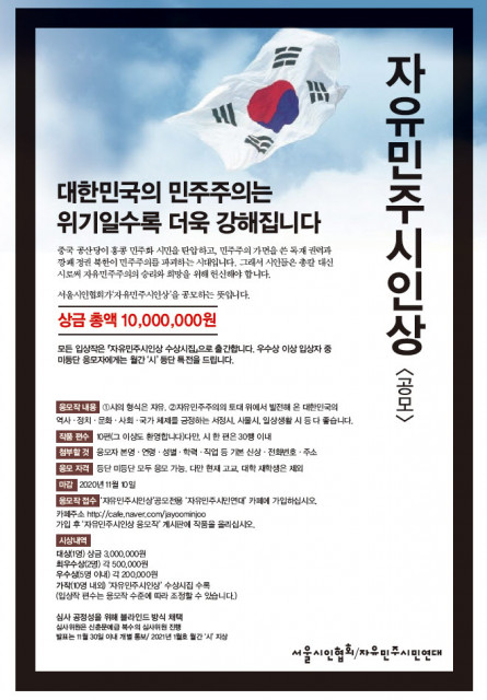 자유민주주의를 신봉하는 시인단체인 ‘자유민주시민연대’가 자유와 민주주의를 주제로 한 시를 공모한다. ‘자유민주주의는 시인이 지키자’는 캐치프레이즈로 실시하는 이 공모전은 총상금 1000만원을 시상하며, 등단과 미등단 제한 없이 누구나 응모할 수 있다. 자유민시민연대는 홍콩 민주화 운동이 중국 당국의 대대적인 체포와 탄압으로 끝내 결실을 맺지 못하게 되는 과정을 지켜보며, 이는 홍콩만의 문제가 아니라 대한민국의 민주주의도 안심할 수 없다는 데 인식을 함께하는 시인들이 결성한 단체이다. 이번에 첫 사업으로 총상금 1000...