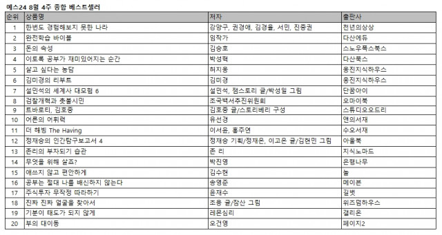 예스24 8월 4주 종합 베스트셀러에서는 다섯명의 전문가의 정치 대담을 엮은 <한번도 경험해보지 못한 나라>가 1위에 등극했다. 자녀교육 학습 전문가인 인생 멘토 임작가의 엄마표 완전 학습법을 담은 <완전학습 바이블>은 네 계단 상승해 2위에 올랐다. 스노우폭스 그룹의 김승호 회장이 전하는 맨손에서 종잣돈을 만들고 돈을 불리는 75가지 방법 <돈의 속성>과 스스로 공부가 하고 싶다는 생각을 하게 도와주는 청소년 분야 스테디셀러 <이토록 공부가 재미있어지는 순간> 10만부 기념 스페셜 에...