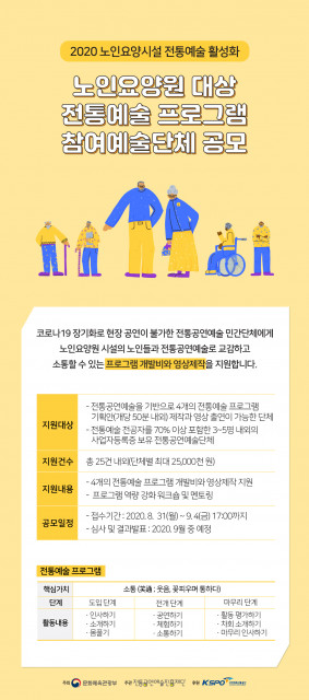 전통공연예술진흥재단(이사장 정성숙)은 ‘노인요양시설 전통예술 활성화 사업’ 전통예술 프로그램 개발 및 영상 기획안 공모에 참여할 예술단체를 8월 31일(월)부터 9월 4일(금)까지 모집한다. 2018년 시작돼 올해로 3회를 맞이한 이 사업은 고령화 사회 속 문화예술 향유 기회가 제한적인 노인요양시설 입소 어르신을 대상으로 한 문화향유 사업이다. 매년 전통예술단체 20여 팀을 선발해 감상 위주의 단순 공연과는 달리 소통 위주의 신체·공연·참여활동으로 프로그램을 개발 및 진행해왔다. 지금까지 140개 요양원에 방문해 100...