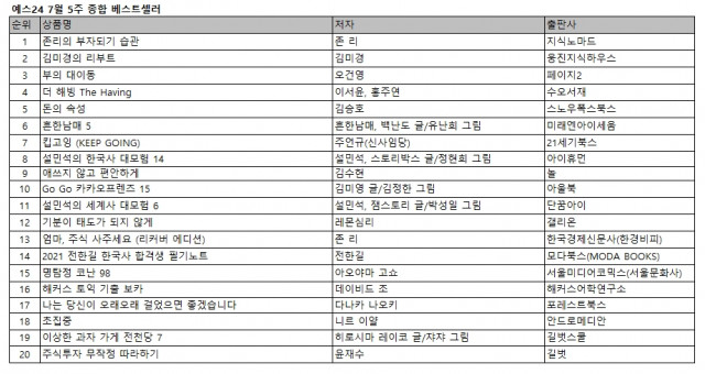 예스24 7월 5주 종합 베스트셀러에서는 메리츠자산운용 대표이사 존 리의 투자 입문서 <존리의 부자되기 습관> 10만부 기념 리커버 한정판이 1위에 등극했다. 유튜브 채널 ‘MKTV 김미경 TV’의 스타 강사 김미경이 전하는 코로나19 이후 일자리와 비즈니스 위기 극복을 위한 현실적인 매뉴얼 <김미경의 리부트>는 전주와 동일하게 2위를 유지했다. 유튜브에서 큰 인기를 끌고 있는 ‘삼프로TV_경제의 신과 함께’ 출연자 오건영 작가의 투자 인사이트를 담은 <부의 대이동>은 두 계단 내려 3위에 안착했...