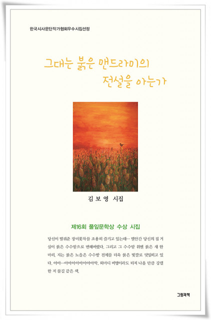 영어 강사 김보영 시인의 첫 시집 ‘그대는 붉은 맨드라미의 전설을 아는가’가 그림과책에서 출간됐다. 김보영 시인은 이번 시집을 내면서 자서에서 간단명료하게 소감 등을 적어냈다. 시 창작 강사를 겸하고 있는 마경덕 시인은 다음과 같이 이번 시집의 해설을 밝혔다. ‘김보영의 시편들은 차분함과 저돌적인 힘을 동시에 보여준다. 안과 밖이 다른 이중성은 차갑거나 뜨겁다. 예측이 어려운 어느 지점에서 격돌하는 힘은 싱싱한 에너지를 방출하고 시의 갈피갈피 쓸쓸함 속에 깃든 열정이 불쑥 튀어나와 순식간에 결말을 뒤집는다. 색(色)의 놀이...
