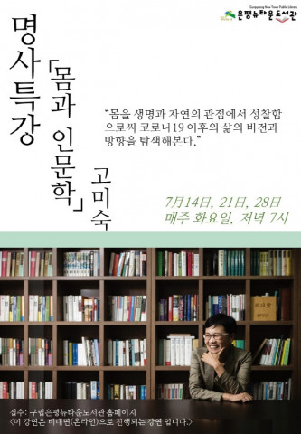 구립은평뉴타운도서관(관장 박종범)은 작가 겸 고전평론가로 잘 알려진 고미숙 작가를 초청해 7월 14일부터 28일까지 매주 화요일 저녁 7시 명사특강 <고미숙의 몸과 인문학>을 운영한다고 밝혔다. 인문학자이자 평론가로도 활동 중인 고미숙 작가는 다양한 방송과 강연을 통해 인문학의 새로운 시각과 비전을 제시하는 학자로 ‘나의 운명 사용설명서’, ‘스무 살의 인문학’, ‘열하일기, 웃음과 역설의 유쾌한 시공간’, ‘몸과 인문학’, ‘동의보감, 몸과 우주 그리고 삶의 비전을 찾아서’ 등의 저자이기도 하다. 작가는 이번 강...