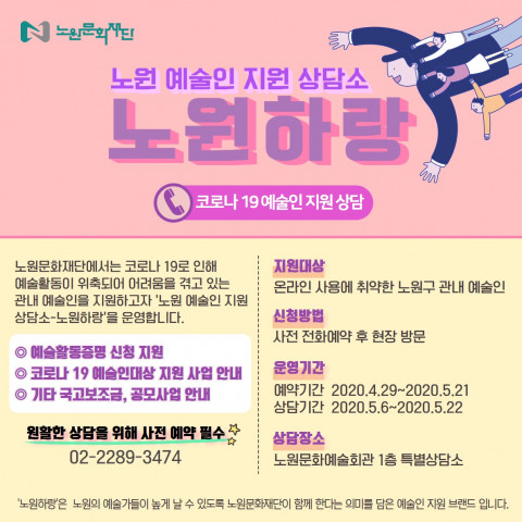 노원문화재단(이사장 김승국)이 코로나19로 어려움을 겪는 지역 예술인을 지원하기 위한 ‘노원구 예술인 지원 상담소: 노원하랑(이하 노원하랑)’을 4월 29일부터 5월 22일까지 24일간 운영한다. ‘노원하랑’은 ‘함께 높이 날다’라는 순우리말 ‘하랑’에 노원을 더해 코로나 19로 인한 관내 예술인의 피해를 극복하고 함께 날아오르자는 의미로 기획됐다. ‘노원하랑’은 △예술활동증명 신청 △예술인 지원사업 안내 △국고보조금 지원 공모사업 안내 등 다양한 서비스를 제공할 예정이다. 특히 이번 서비스는 온라인 서비스 이용이 원활하지 ...