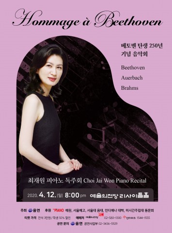 최재원 피아노 독주회가 4월 12일 오후 8시 예술의전당 리사이틀홀에서 개최된다. 이번 독주회는 ‘Hommage a Beethoven’이라는 부제를 가지고 연주를 선보일 예정이다. ◇피아니스트 최재원 피아니스트 최재원은 예원학교, 서울예술고등학교, 서울대학교 음악대학(차석입학, 장학생)을 졸업하였으며 이후 미국 인디애나 대학교(Indiana University, Pi Kappa Lambda Award)에서 석사학위(M.M.)를, 미시간 주립대학교(Michigan State University, Phi Beta Delta...