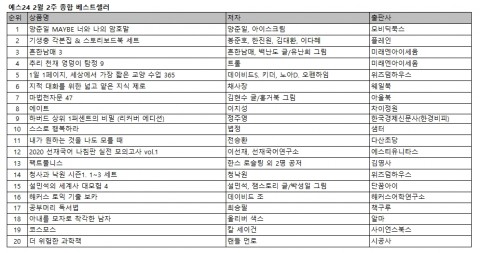 예스24 2월 2주 종합 베스트셀러에서는 가수 양준일의 포토에세이 <양준일 MAYBE 너와 나의 암호말>이 2주 연속 1위에 등극했다. 아카데미 4관왕을 달성한 영화 기생충의 기록을 담은 <기생충 각본집 & 스토리보드북 세트>가 새롭게 2위에 올랐고 인기 크리에이터 ‘흔한남매’의 세 번째 이야기 <흔남남매 3>이 전주 대비 한 계단 올라 3위를 차지했다. 어린이를 위한 추리 동화 시리즈 <추리 천재 엉덩이 탐정 9>가 전주 대비 두 계단 내려 4위를 기록했고 역사, 문화, 미술, 과학 ...