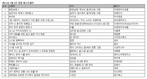 예스24 1월 4주 종합 베스트셀러에서는 유튜브 구독자 수가 160만명에 이르는 인기 크리에이터 ‘흔한남매’의 세 번째 이야기 <흔한남매 3>이 4주째 연속 1위로 정상의 자리를 지켰다. 설민석이 전하는 세계사 초등학습 만화 시리즈 <설민석의 세계사 대모험 4> 로마편과 인공지능에게 대체되지 않는 방법론을 일러주는 이지성 작가의 <에이트>가 전주 대비 다섯 계단씩 올라 각각 2위, 3위를 기록했고 역사, 문화, 미술, 과학 등의 분야를 아우르는 365편의 교양 필독서 <1일 1페이지, 세상에...