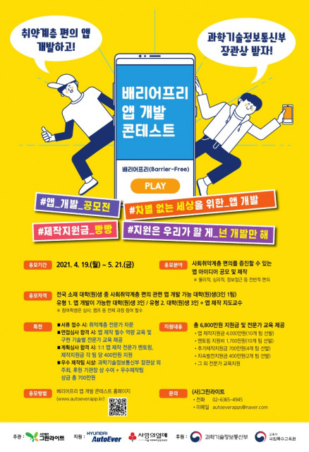 현대오토에버와 서울사회복지공동모금회가 지원하고, 사단법인 그린라이트가 주관하며, 과학기술정보통신부와 국립특수교육원이 후원하는 사회취약계층 편의를 위한 대학(원)생 대상 ‘배리어프리 앱 개발 콘테스트’가 개최된다. 올해 5년째를 맞는 배리어프리 앱 개발 콘테스트(이하 콘테스트)는 사회적 취약계층 편의를 증진할 대학생들의 반짝이는 아이디어를 공모한다. 앱 개발에 필요한 다양한 맞춤형 교육과 멘토링 기회 제공, 제작 지원금 등 총 6800만원을 지원한다. 특히 올해 콘테스트는 서류 제출 단계에 ‘취약계층 전문가 질의응답’과 개...