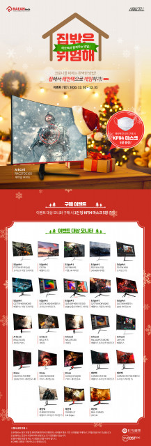 게이밍 모니터 명가 래안텍(대표 신은정)이 비대면 시대 연말을 맞아 자사 인기 모니터 23종을 대상으로 코로나19 극복을 위한 ‘래안텍과 함께하는 연말! 집밖은 위험해’ 구매 이벤트를 진행한다고 밝혔다. 참여 방법은 간단하다. 12월 1일부터 12월 31일까지 이벤트 안내가 반영된 판매 사이트에 한해 대상 모니터를 구매하면 참여가 완료된다. 구매자 전원에게는 1인당 KF94 인증 마스크 5장이 1:1 증정된다. 이벤트 대상 모델은 무결점을 기본으로 베젤리스 디자인, 고주사율, 프리싱크, 울트라 와이드, 커브드 디자인 등 게임...