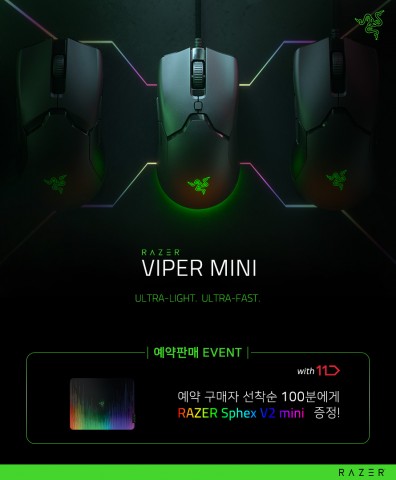 글로벌 게이밍 라이프 스타일을 주도하는 RAZER™이 더욱 작고 가벼워진 Viper 게이밍 마우스 에디션 ‘RAZER Viper Mini’를 공식 출시한다. RAZER 공식수입사 웨이코스는 정식 판매 일정에 맞춰 6일부터 사전예약판매 행사를 실시한다고 밝혔다. 사전예약판매는 11번가를 통해 진행되며 구매고객에게는 사은품과 함께 다양한 경품이 제공된다. RAZER Viper Mini는 프로게이머 게이머 마우스로 인기 있는 Viper 제품 라인업 중 최신 제품으로 해외 유명 하드웨어 리뷰채널에서 수상한 풀사이즈 Viper 하드웨...