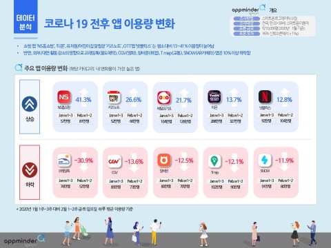 국내 코로나19 확진 환자가 발생한 1월 20일 전후 산업별 앱 이용량에도 희비가 나타났다. 마케팅·여론 조사 전문기관인 NICE디앤알(대표 강용구)의 모바일 앱 분석 서비스 앱마인더(appminder)에서 앱 로그데이터를 분석한 결과다. ‘배달’ 앱 이용자는 2020년 1월 셋째 주 대비 2월 첫째 주 이용량이 13% 증가했다. 이는 해당 기간 내 금토일 평균 이용량을 기준으로 했다. 또한 같은 기간 동안 ‘온라인 쇼핑’ 앱 이용량 역시 5.1% 증가했다. 감염 우려로 바깥 활동 보다 주로 집 안에서의 소비가 활발했던 것...