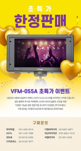 방송장비 전문 브랜드 티브이로직(TVLogic)은 2020년 경자년을 맞아 기존보다 약 60% 이상 할인된 파격적인 가격 55만원(부가세 별도)에 전문가용 5.5인치 OLED 모니터 VFM-055A를 구매할 수 있는 이벤트를 진행 중이다. VFM-055A는 5.5 인치 Full HD 해상도의 OLED 패널을 장착한 모니터로 깊은 블랙과 17000:1의 높은 명암비, 넓은 색재현 범위를 통해 기존의 LCD 모니터들과 차별화된 영상을 제공해 출시 이후로 꾸준히 고객들로부터 사랑받아 온 티브이로직 대표 뷰파인더 모니터이다. 샤프니...