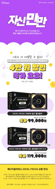 에너지옵티머스 ‘EXCEL FOCUS 1000W 80PLUS GOLD FULL MODULAR ATX 3.0’ 4차 추가 입고 물량 완판 기념 할인 이벤트 진행