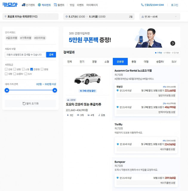 카모아, 토론토 렌터카 예약 서비스 제공… 캐나다 13개 도시서 차량 대여 가능